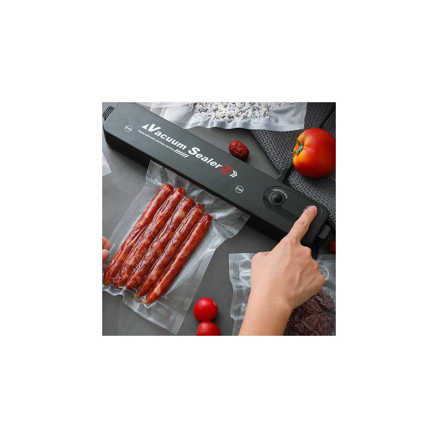 SELLADORA AL VACIO MAS ROLLO DE BOLSAS DE 5 METROS 🌟¡Conserva tus alimentos frescos por más tiempo con nuestro increíble sellador al vacío! 🌟🍎 ¿Cansado de desperdiciar comida? Nuestro sellador al vacío es la solución perfecta para mantener tus alimentos frescos y deliciosos en casa. Ya sea carne, mariscos, frutas, verduras o bocadillos, este sellador hará que tus alimentos se mantengan en óptimas condiciones por más tiempo. 🥩🍤🍓🥦🥪✨ Con su potente succión y su rango de sellado de 29 cm de largo, podrás sellar rápidamente y en múltiples paquetes. ¡Adiós a los alimentos mal conservados! Además, su diseño pequeño y ligero lo hace fácil de transportar, para que puedas disfrutar de alimentos frescos en cualquier lugar. 🚀👜